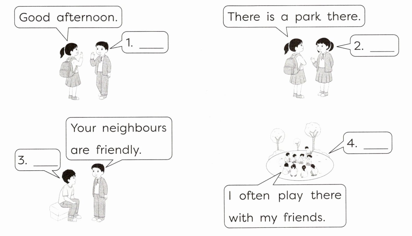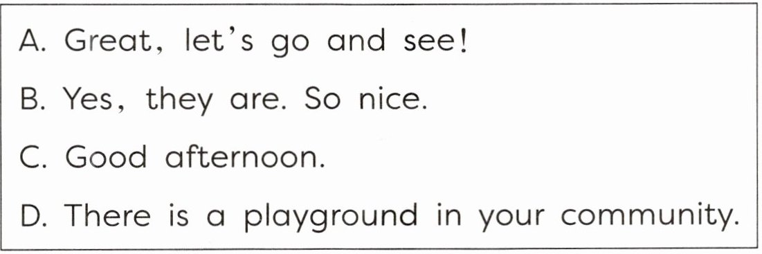Ⅳ. Look and choose. (Chen Jie 看到住在社区的同学们在聊天。读一读,根据情景选择正确的选项。)