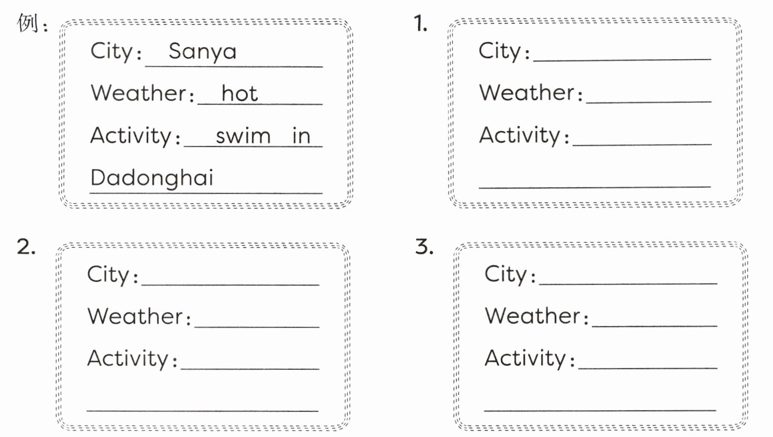 Ⅳ. Read and write. (Chen Jie 准备暑假和朋友们去海南游玩,为此她提前对海南几个市县做了气象调查。请根据调查报告将信息卡补充完整。)