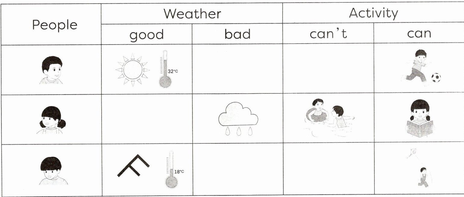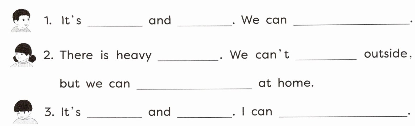 1. sunny, hot, play football 2. rain, swim, read books 3. windy, cool, fly a kite
