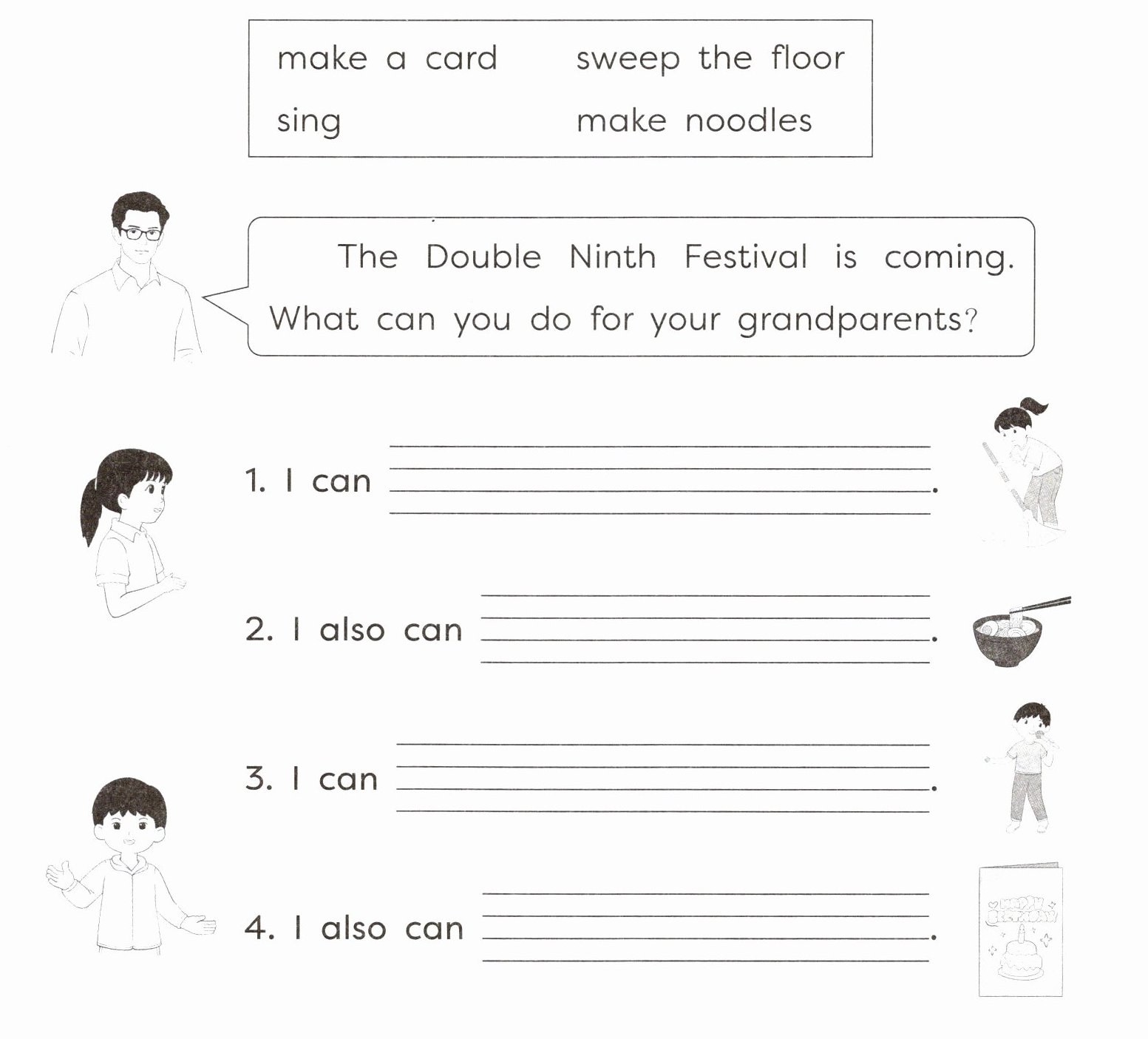 Ⅳ. Choose and write. (Jack 一家要在重阳节去拜访爷爷奶奶。根据图片,选择合适的单词或短语填在四线三格中。)