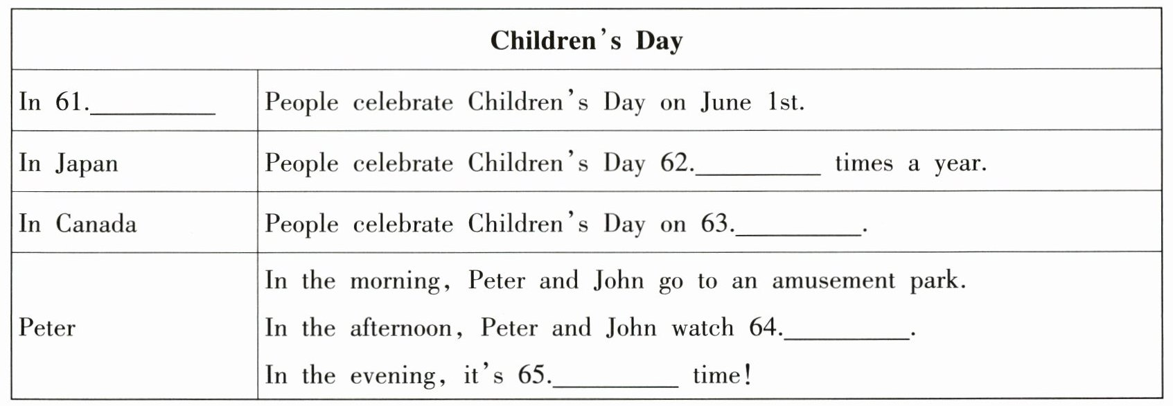 61.China 62.three 63.November 20th 64.a film 65.party 66.His brother/John. 67.He likes the day./ He has a good time. 68.I want to go to the park. Because I like playing games with my friends in the park. (言之有理即可)