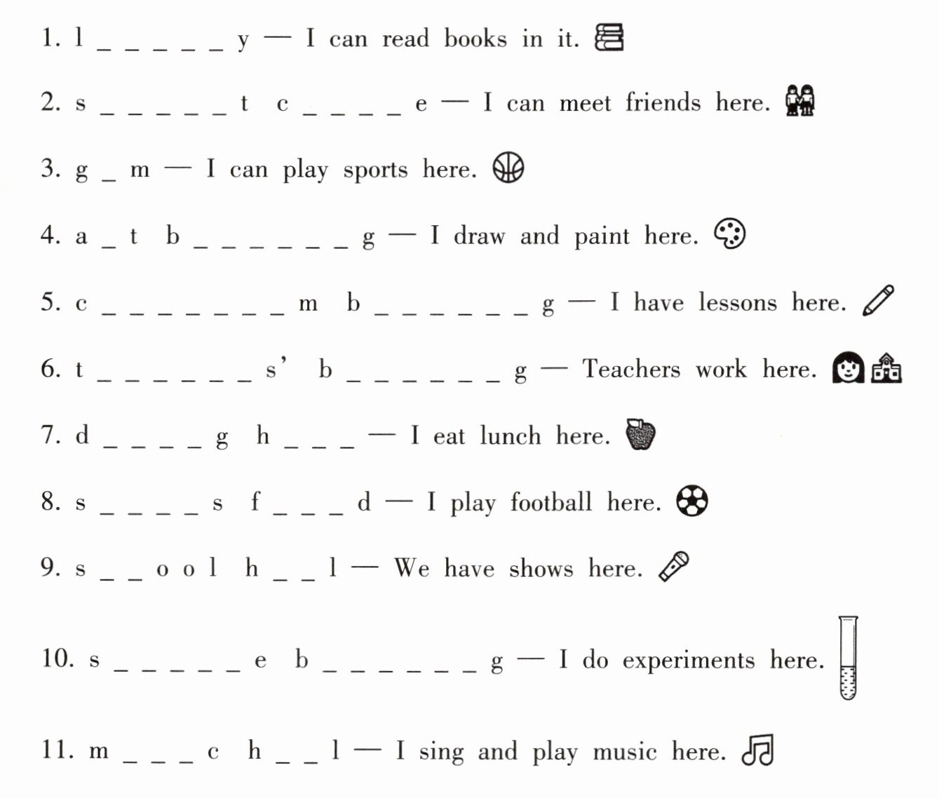 1. library 2. student centre 3. gym 4. art building 5. classroom building