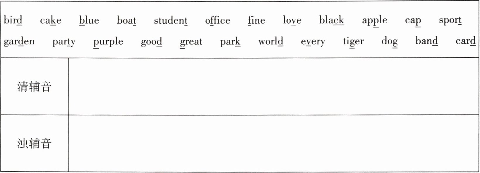 清辅音:cake boat student office fine black apple cap sport party purple park 浊辅音:bird blue love garden good great world every tiger dog band card