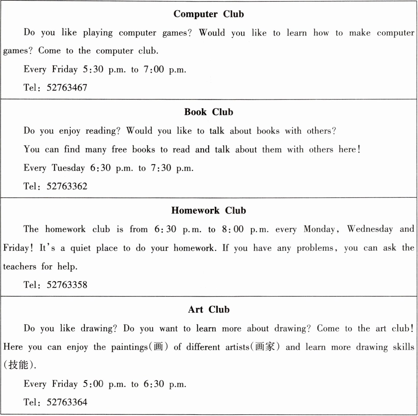 )3. What can you do in the homework club?A. Get the teachers’ help. B. Read free books. C. Meet some artists.