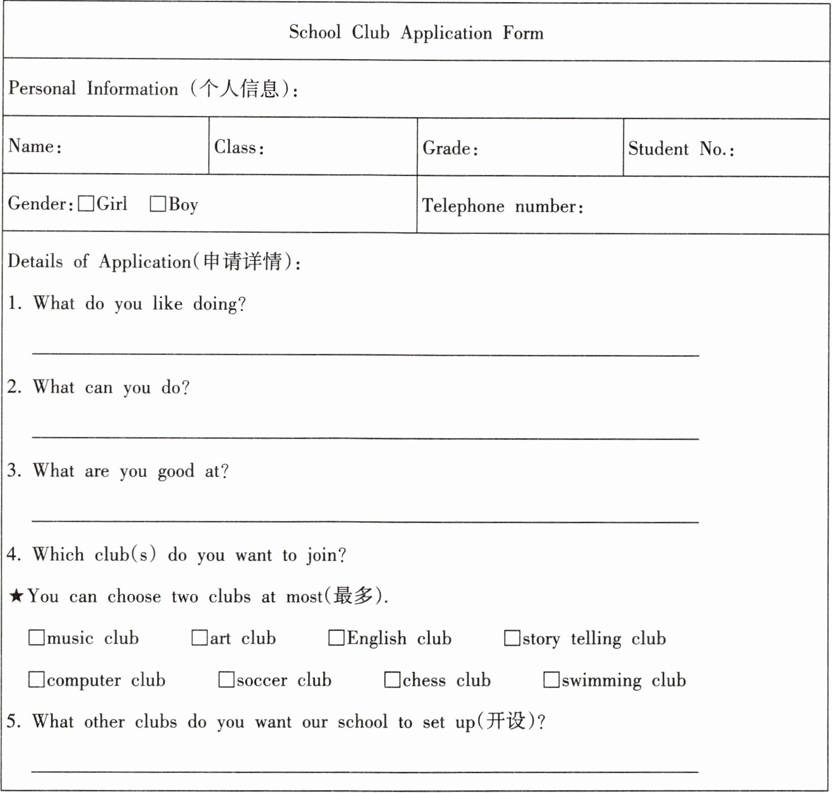 Ⅰ. 你对哪个俱乐部感兴趣呢?请完成下面的俱乐部申请表。