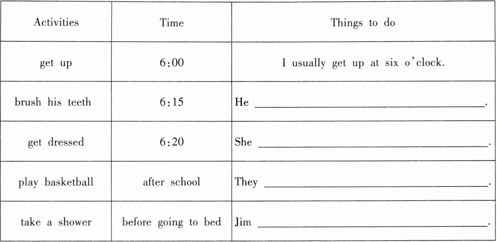 Ⅱ. 根据上表所填的内容,写出五个句子介绍你的日常作息。