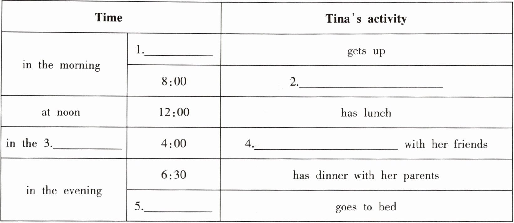 On Sunday, Tina gets up at half past seven. She has breakfast at eight o’clock. She has eggs for breakfast. She does her homework in the morning. She has lunch at twelve o’clock. At about four p.m., she goes out to play sports with her friends. She has dinner with her parents at half past six. In the evening, she watches TV for about two hours. Then she goes to bed at a quarter to ten.