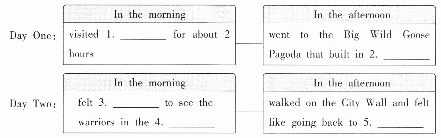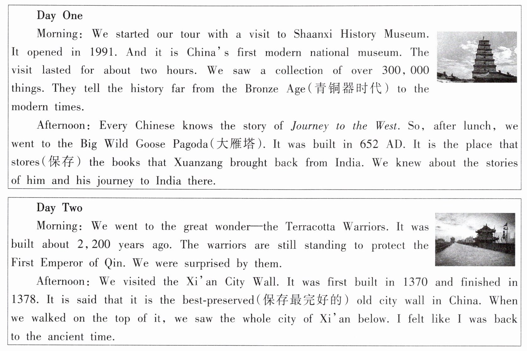 任务一:1. Shaanxi History Museum 2. 652 AD 3. surprised 4. Terracotta Warriors 5. the ancient time 任务二:6. They tell the history far from the Bronze Age to the modern times. 7. The writer felt proud of the history of the old city, even that of our great country. 8. I'd choose the Terracotta Warriors. They show ancient China's art and wisdom. It's a great chance to feel the power of history and our ancestors' creativity. (答案不唯一,合理即可)