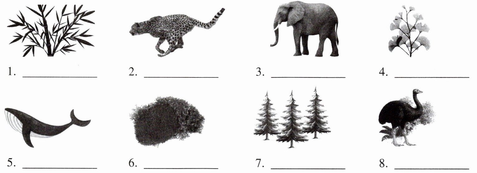 1. bamboo 2. cheetah 3. African elephant 4. ginkgo tree 5. blue whale 6. moss 7. redwood tree 8. elephant bird