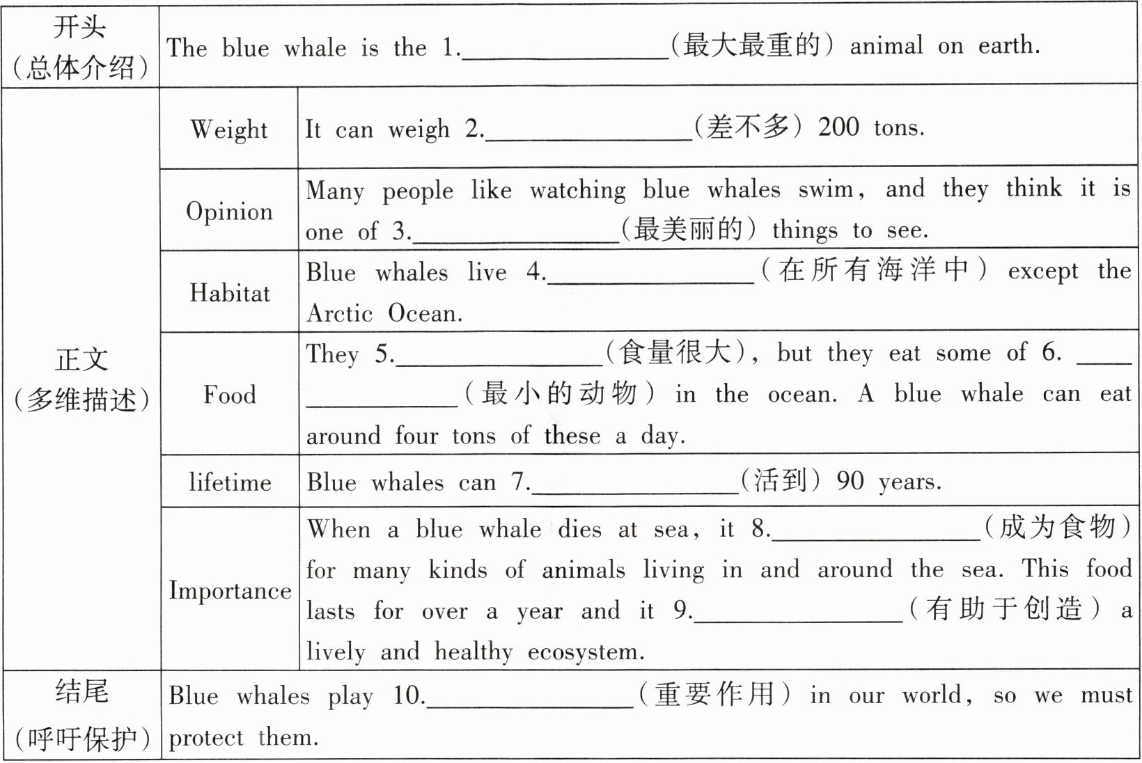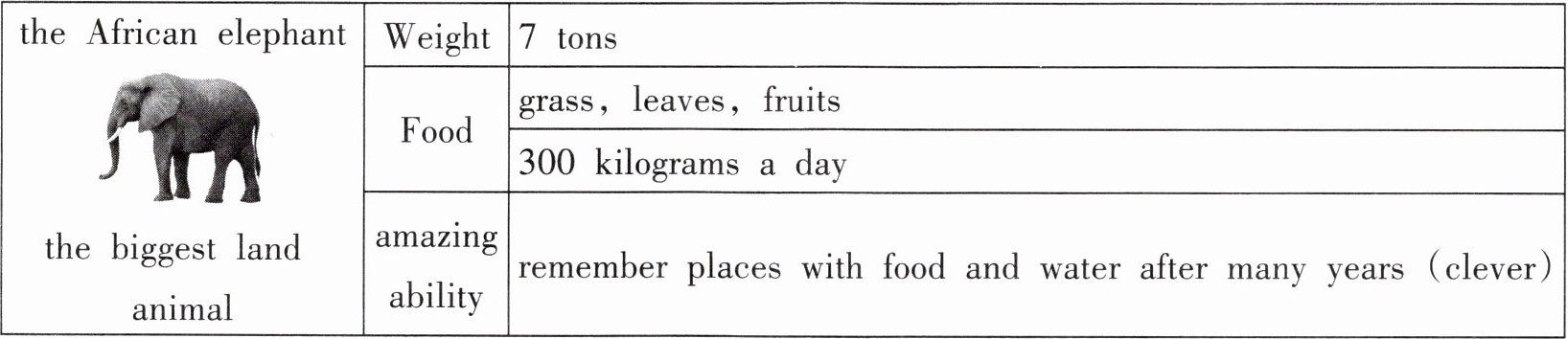 任务一:1. largest and heaviest 2. as much as 3. the most beautiful 4. in all oceans 5. eat a lot 6. the tiniest animals 7. live up to 8. becomes food 9. helps to create 10. an important role 任务二:1. C 2. A 3. B 任务三:1. The African elephant is the biggest land animal on earth. It can weigh as much as 7 tons. 2. African elephants eat a lot, but they only eat grass, leaves and fruits. An African elephant can eat around 300 kilograms of these a day. 3. The African elephant is one of the cleverest animals. They can remember places with food and water after many years.