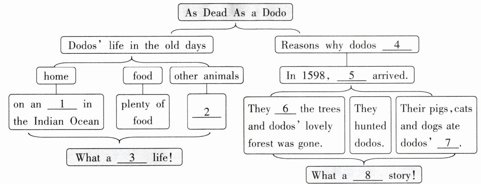 任务一:Paragraph 3 Picture D The reasons why dodos died out. Paragraph 2 Picture A Happy old days. Paragraph 4 Picture C Suggestions about helping animals. Paragraph 1 Picture B An introduction to dodos. 任务二:1. island 2. friendly 3. peaceful and safe 4. died out 5. humans 6. cut down 7. eggs 8. sad 任务三:9. Because dodos died out and people won't see them in nature. 10. The writer uses them to show strong happiness and sadness. The contrast makes the different feelings much stronger. What's more, "as dead as a dodo" is to echo the title. 11. Human activities can cause serious problems for animals. Every animal is important. If we don't take care of nature, more animals might disappear like the dodo. Let's protect them and help them live safely and happily!