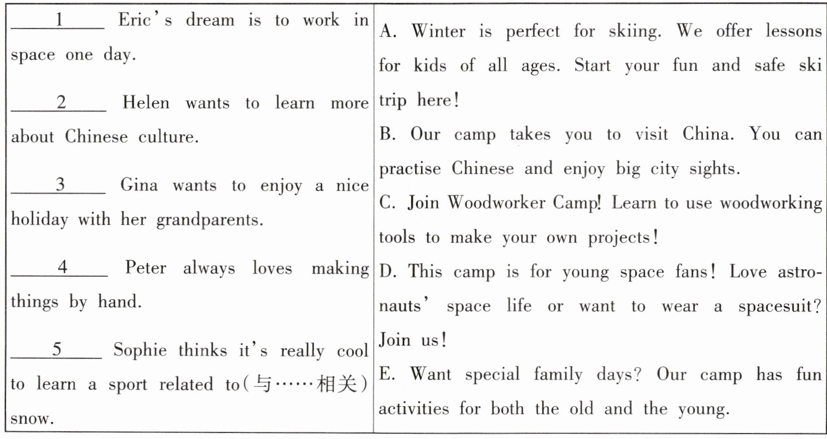 Ⅳ.配对阅读。左栏是对五位学生兴趣和需求的描述,右栏是五个不同的夏令营的简介,请为左