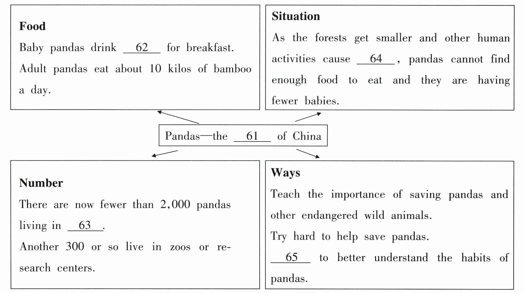 61. symbol 62. milk 63. the forests / the wild 64. more problems / problems / many problems 65. Do research 66. Lin Wei thinks pandas are so cute and lovely. 67. Because the babies often die from sicknesses and do not live very long. 68. First, I will learn the importance of saving pandas and other endangered wild animals. Second, I will learn the knowledge about protecting them. And I will be kind to animals. (答案不唯一,言之有理即可)
