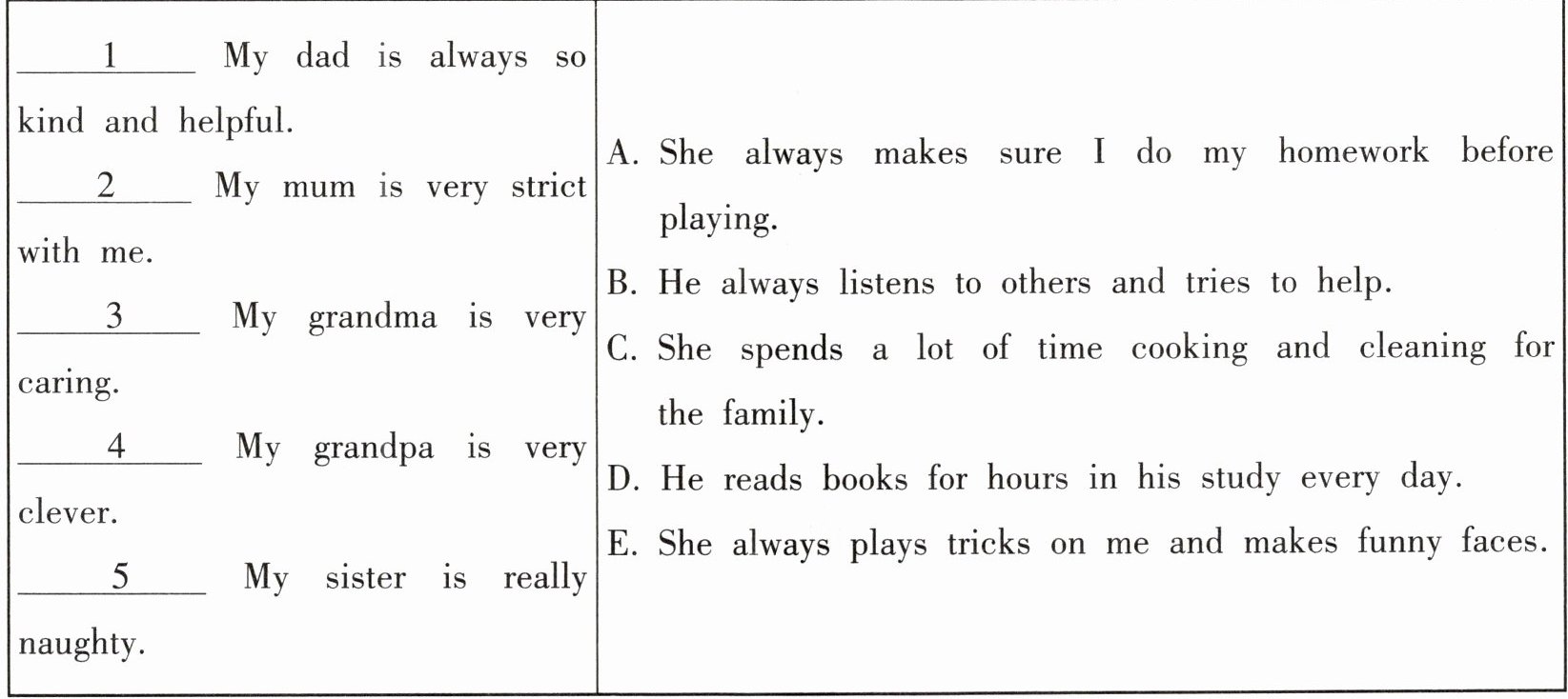 Ⅴ. 配对阅读。左栏是张磊对家人的评价,右栏是他们的日常行为。请将二者进行匹配,并将答案标在相应位置上。