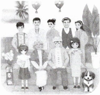 There are nine people in the photo. The boy on the left is me. My parents are next to me. My father's name is Zhang Kai and my mother's name is Wang Mei. On their right are my dad's sister — my aunt Zhang Ling, and my uncle Lin Tao. Who is the girl in front of them? Oh, she is my uncle and aunt's daughter, Lin Fang. We are of the same age. She is a quiet girl. My grandparents are sitting on the sofa. They are smiling happily. On their left is my little sister, Xiaoxue. She is very naughty. We often play games with Lucky. Do you see Lucky on the ground? It's my grandparents' pet dog. It is so cute. We all like it.