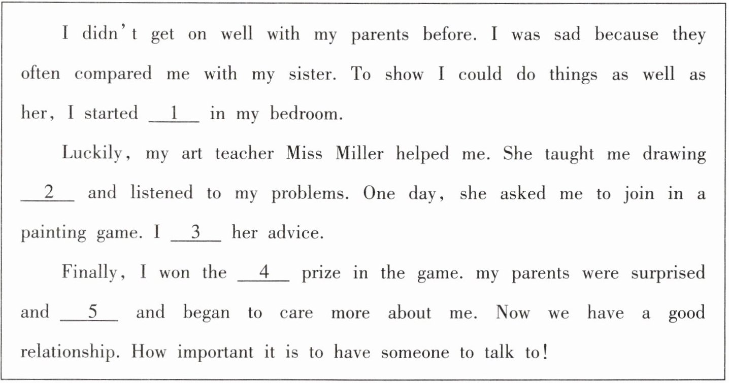 After waiting, the result came out. I won the first prize! When I took it home, my parents were surprised and happy. They started to care more about me. Now, we get on well. And I know it's important to have someone to talk to.