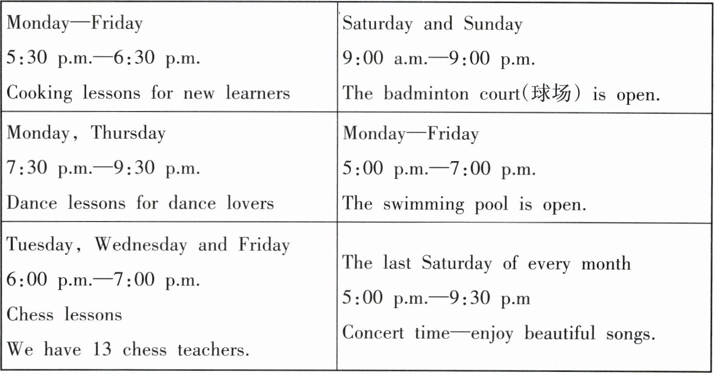 )41. You can’t have cooking lessons on ______.A. Wednesday B. Thursday C. Sunday