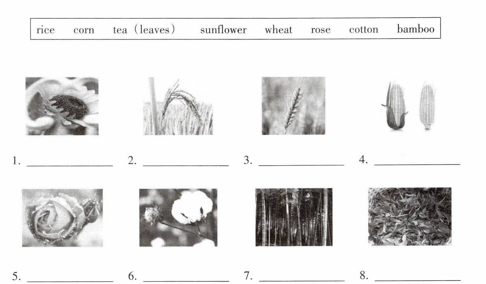 1. sunflower 2. rice 3. wheat 4. corn 5. rose 6. cotton 7. bamboo 8. tea (leaves)