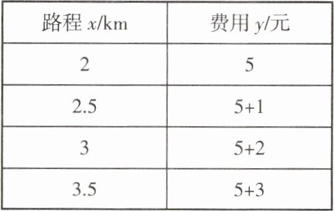 由表格数据可知:起步路程2km对应费用5元,每增加0.5km费用增加1元,即每公里费用为2元。