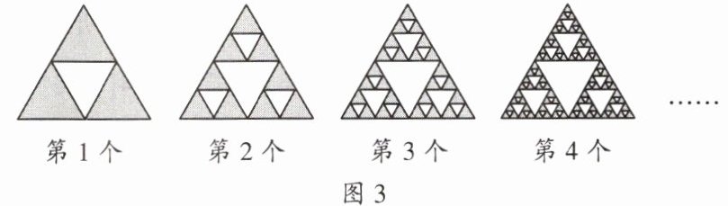 反复进行下去,就可以得到无限细节的谢尔宾斯基三角形,如图3所示,按此规律,第$n$个图形中剩余的三角形(灰色三角形)的个数为