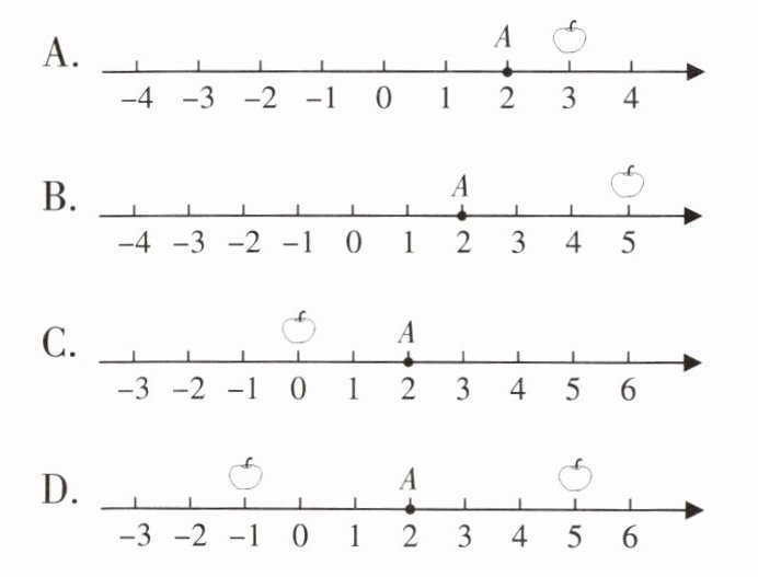 5. 已知数轴上的$A$点表示的数为2,一个苹果在数轴上,到$A$点的距离为3,则小红把苹果放置正确的是 (