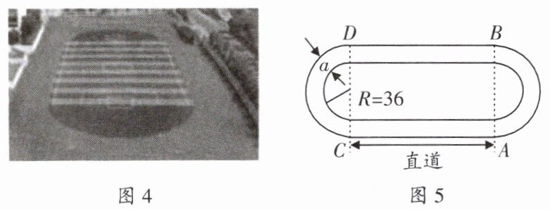 如图4是某校操场实物图,图5是操场示意图,每条跑道由两条直的跑道和两端是半圆形的跑道组成,每两条跑道之间的距离是相等的,活动小组对学校操场跑道最内圈长为400米的跑道进行规划设计,且最内圈两端半圆弧的半径$R$为36米.($\pi$取3.14)