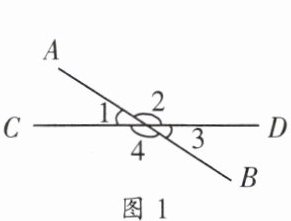 1. 如图1,$AB$与$CD$相交所成的四个角中,若$\angle1 = 25^{\circ}$,则$\angle2 =$