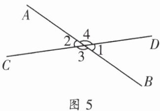 3. 如图5,直线$AB$与$CD$相交于一点,$\angle3 - \angle1 = 80^{\circ}$,则$\angle2$等于(