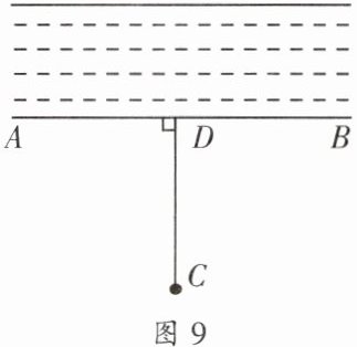 3. 如图 9,计划把河水引到水池 $C$ 中,可先过 $C$ 点作 $CD \perp AB$,垂足为 $D$,然后沿 $CD$ 开渠,则能使所开的渠最短,这种设计方案的根据是