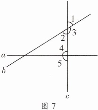 四、如图7,直线$a$、$b$、$c$两两相交,$\angle1 = 60^{\circ}$,$\angle2 = \frac{2}{3}\angle4$,求$\angle3$、$\angle5$的度数.