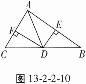 9. 如图 13-2-2-10,在△ABC 中,AD 是中线,DE⊥AB,DF⊥AC,垂足分别为 E,F,若 AB = 6,AC = 4,求$\frac{DE}{DF}$的值。