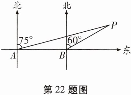 22.(6分)某轮船由西向东航行,在A处测得小岛P的方位是北偏东75°,又继续航行16 n mile后,在B处测得小岛P的方位是北偏东60°。