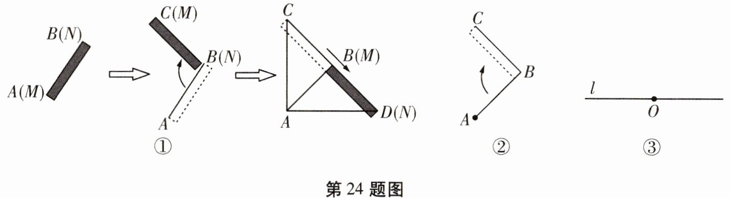 24.(8分)(2024兰州中考)观察发现:劳动人民在生产生活中创造了很多取材简单又便于操作的方法,正如木匠刘师傅的“木条画直角法”。如图①,他用木条能快速画出一个以点A为顶点的直角,具体作法如下:①木条的两端分别记为点M,N,先将木条的端点M与点A重合,任意摆放木条后,另一个端点N的位置记为点B,连接AB;②木条的端点N固定在点B处,将木条绕点B顺时针旋转一定的角度,端点M的落点记为点C(点A,B,C不在同一条直线上);③连接CB并延长,将木条沿点C到点B的方向平移,使得端点M与点B重合,端点N在CB延长线上的落点记为点D;④用另一根足够长的木条画线,连接AD,AC,则画出的∠DAC是直角。