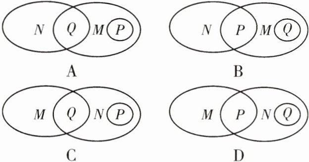 【例 2】设 $ M $ 表示直角三角形,$ N $ 表示等腰三角形,$ P $ 表示等边三角形,$ Q $ 表示等腰直角三角形。下列四个图中,能正确表示它们之间关系的是 (