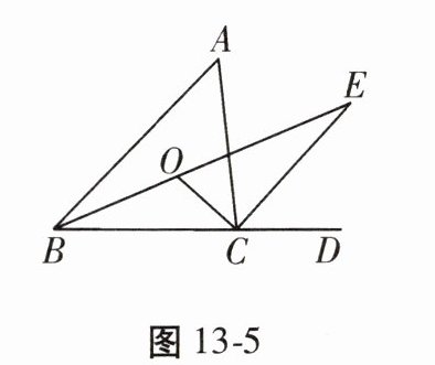 8. 如图13-5,在△ABC中,BO,CO分别平分∠ABC,∠ACB,交于点O,CE为外角∠ACD的平分线,BO的延长线交CE于点E,若∠BOC = 115°,则∠E = (