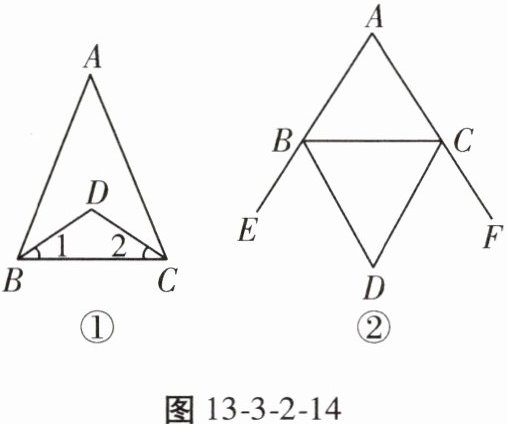 (2)如图 13-3-2-14②,BD,CD 分别是△ABC 的两个外角∠EBC,∠FCB 的平分线,试探究∠D 与∠A 之间的等量关系,并说明理由。