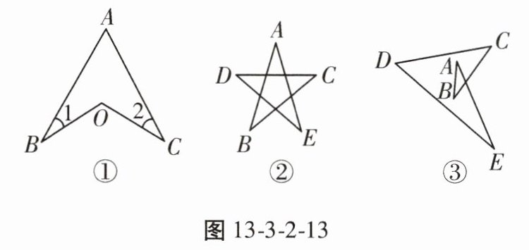 9. (教材 P22 复习题 T9 变式)(1)如图 13-3-2-13①,你知道∠BOC = ∠1 + ∠2 + ∠A 的奥秘吗?请用你学过的知识予以证明;