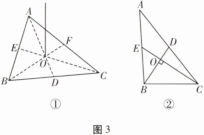 5. 取一块质地均匀的三角形纸板$ABC$,如果用一条细线从重心$O$处将三角形提起来,那么纸板就会处于水平状态。探究图①中$\frac{AO}{DO}$的值是多少。