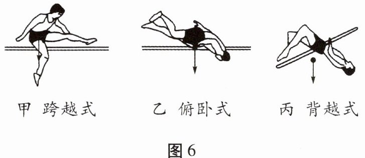 9. 如图6所示是跳高发展的三个历史阶段,假设某运动员采用图甲姿势可跃过$1.70m$,采用图乙姿势可跳过$1.80m$;而采用图丙姿势则有望突破$2m$,试用重心的知识来解释采用“背越式”为何能提高成绩。