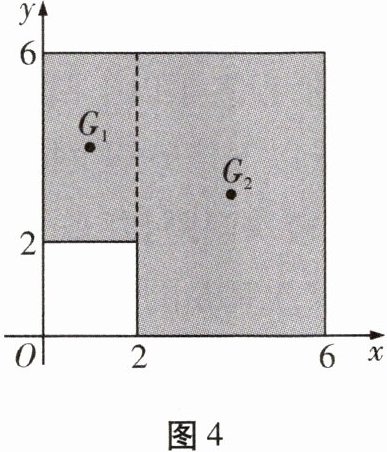 6. 如图4,在平面直角坐标系中有一块均匀薄板,将它沿虚线分成两个小长方形,它们的重心分别为$G_1(1,4)$,$G_2(4,3)$,计算薄板整体的重心坐标。