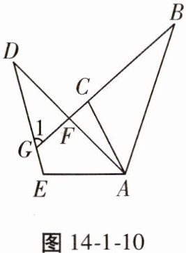 6. 如图 14-1-10,$ \triangle ABC \cong \triangle ADE $,$ BC $ 的延长线交 $ DA $ 于点 $ F $,交 $ DE $ 于点 $ G $。若 $ \angle AED = 105^{\circ} $,$ \angle CAD = 18^{\circ} $,$ \angle B = 30^{\circ} $,则 $ \angle 1 $ 的度数为(