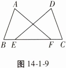 5. 如图 14-1-9,$ \triangle ABF \cong \triangle DCE $,$ \angle A $ 与 $ \angle D $,$ \angle B $ 与 $ \angle C $ 是对应角,请指出这两个全等三角形中其他的对应边和对应角。