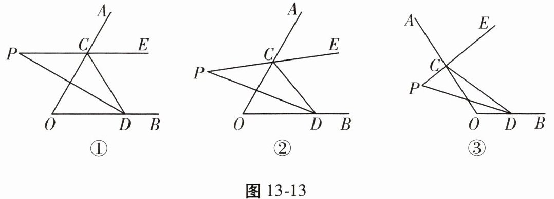 18. (13分)如图13-13,点C,D分别在射线OA,OB上,CE是∠ACD的平分线,CE的反向延长线与∠ODC的平分线交于点P。