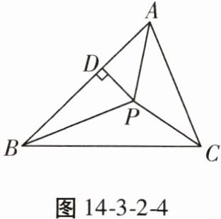 【例2】如图14-3-2-4,已知点P是△ABC三条角平分线的交点,PD⊥AB,若PD = 5,△ABC的周长为20,求△ABC的面积。