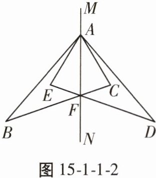 【例2】如图15-1-1-2,$\triangle ABC和\triangle ADE关于直线MN$对称,$BC和DE的交点F在直线MN$上。