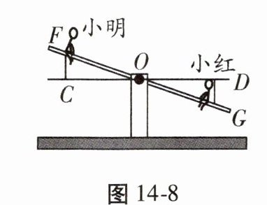 10. 如图 14 - 8,小明与小红玩跷跷板游戏,如果跷跷板的支点 $ O $(即跷跷板的中点)至地面的距离是 50 cm,当小红从水平位置 $ CD $ 下降 40 cm 时,小明离地面的高度是