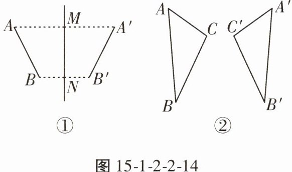 9. (创新意识)我们知道,成轴对称的两个图形中,对称点的连线被对称轴垂直平分。如图 15 - 1 - 2 - 2 - 14①,$AB$ 与 $A'B'$ 关于直线 $MN$ 对称,则 $MN\perp AA'$,$MN\perp BB'$,$AM = A'M$,$BN = B'N$。