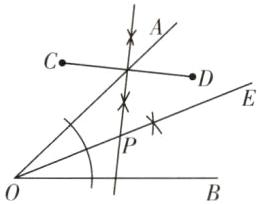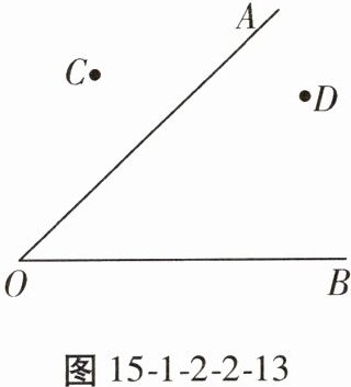 8. (教材 P71 习题 T12 变式)如图 15 - 1 - 2 - 2 - 13,校园里有两条路 $OA$,$OB$,在交叉路口附近有两块宣传牌 $C$,$D$,学校准备在这里安装一盏路灯,要求灯柱的位置 $P$ 离两块宣传牌一样远,并且到两条路的距离也一样远,请你帮助画出灯柱的位置 $P$,并简要说明理由。