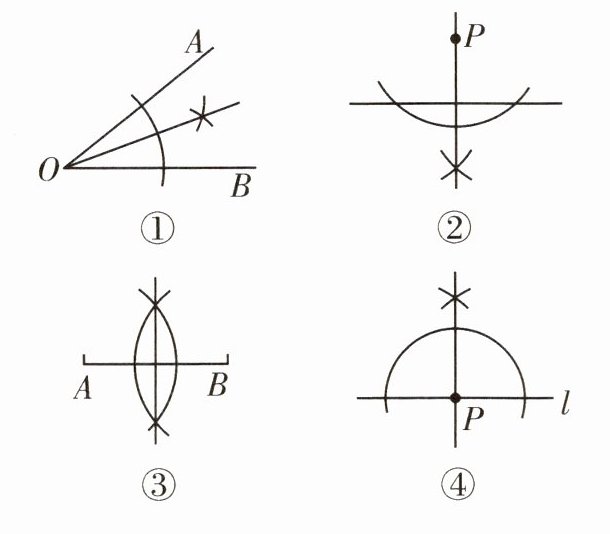 6. 尺规作图要求:Ⅰ. 过直线外一点作这条直线的垂线;Ⅱ. 作线段的垂直平分线;Ⅲ. 过直线上一点作这条直线的垂线;Ⅳ. 作角的平分线。如图 15 - 1 - 2 - 2 - 11 是按上述要求打乱顺序的尺规作图,正确的顺序是 (