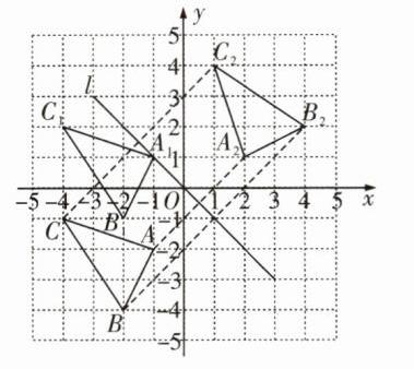 (2)如图,△A₂B₂C₂即为所求,直线l为第二、四象限角平分线所在的直线。
